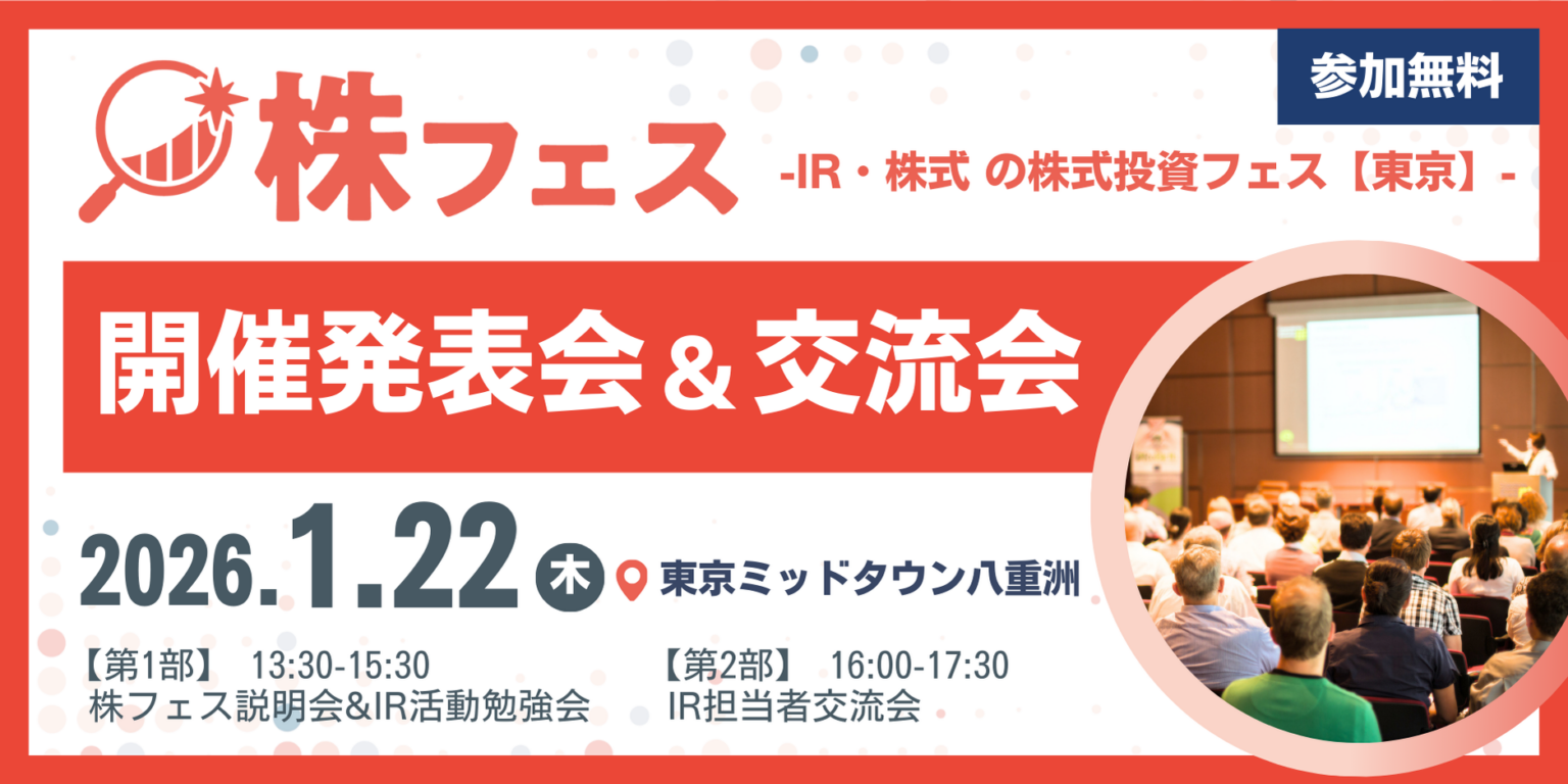 RX Japan合同会社は、2027年2月に予定する「株フェス – IR・株式投資フェス-」に先立ち、キックオフイベント「開催発表説明会」を2026年1月22日に東京ミッドタウン八重洲で開きます。主催者によると、開催発表から約1か月足らずで東証上場企業のIR担当者を中心に160社超・196名の参加申込が集まりました。説明会は無料の事前登録制で、IR(投資家向け広報)や広報、経営企画担当者らが対象です。同社は、数値や資料の提示に偏りがちな従来型から、企業の「想い」や「社会的意義」を対話で伝える「共感型IR」への転換を掲げ、第一部で概要や出展プラン、集客方法の説明とIRスキルアップセミナー、第二部でIR担当者同士の交流会を実施します。本開催は2027年2月26〜27日に東京ビッグサイトで行い、120社の参加と来場者1万5000人(いずれも主催者見込み)を想定しています。個人投資家との接点づくりが広がるかが今後の焦点です。