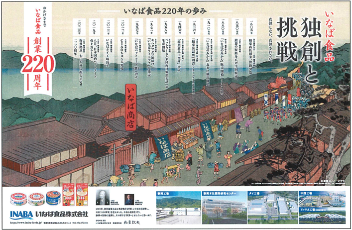 いなば食品は2026年2月10日、日本経済新聞朝刊(全国版)に創業220周年を記念した全30段(見開き全面カラー)の広告を掲載しました。静岡県静岡市清水区由比を拠点とする同社の事業の変遷を、年表とビジュアルで示しています。