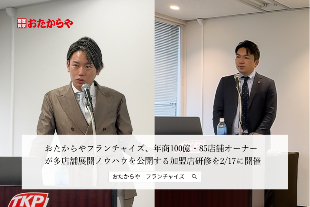 買取専門店「おたからや」を展開するいーふらん(神奈川県横浜市)は2026年2月17日、既存フランチャイズ加盟店オーナー向けの研修会を開きました。講師は、加盟後6年で年商100億円、85店舗を運営する株式会社アンビション(塚本拓夢代表)で、多店舗展開の進め方を解説しました。