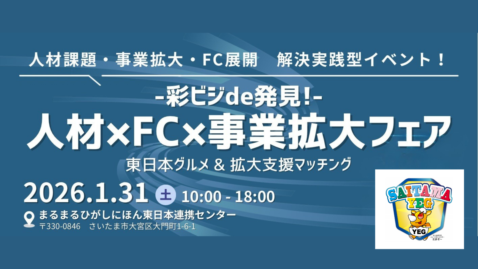 さいたま商工会議所青年部(さいたまYEG)は2026年1月31日10時~18時、さいたま市大宮区の東日本連携センター「まるまるひがしにほん」で、経営者層向けの広域ビジネスマッチング「彩ビジde発見!人材×FC×事業拡大フェア」を開きます。人材課題、事業拡大、フランチャイズ(FC)展開の3テーマで展示・商談とセミナー、個別相談を行い、商談成立50件を目標に掲げます。参加費は無料で事前登録制です。