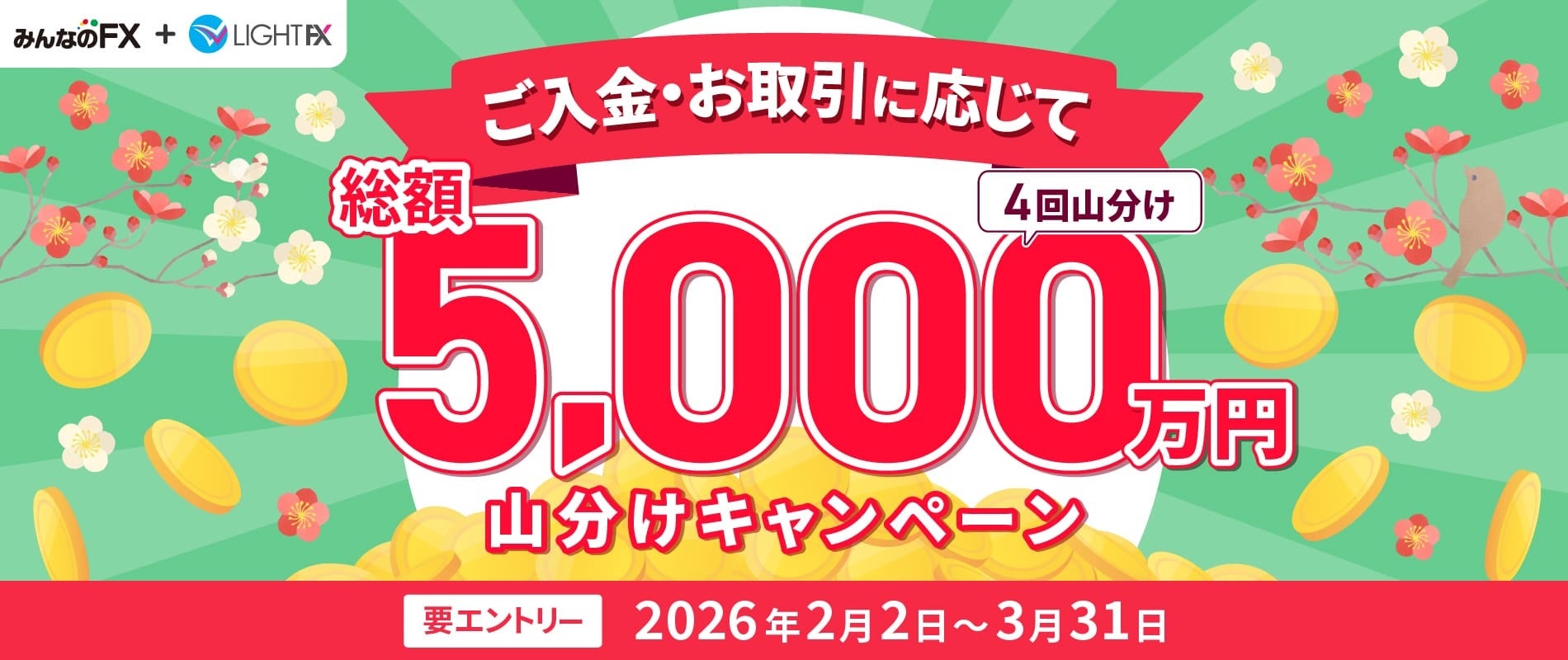 トレイダーズホールディングスのグループ会社でFXサービスを運営するトレイダーズ証券は、外国為替取引サービス「みんなのFX」と「LIGHT FX」で、総額5,000万円(2サービス合算)を山分けするキャンペーンを2026年2月2日から実施します。対象は期間中に入出金差額10万円以上と新規取引10Lot以上を満たした利用者です。