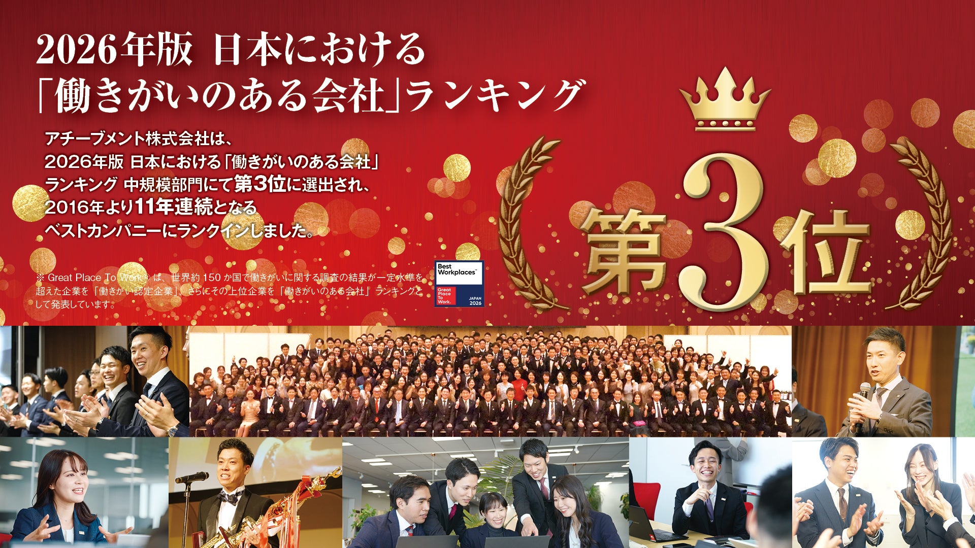 アチーブメント株式会社は2026年版「働きがいのある会社」ランキングで中規模部門第3位にランクインをいたしました。