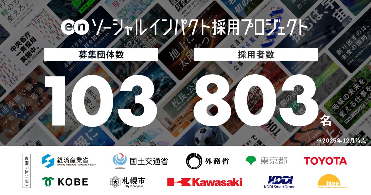 エン(東京都新宿区)が採用支援する「ソーシャルインパクト採用プロジェクト」の累計支援団体数が100団体を超え、同プロジェクト経由の累計採用決定数は800名に達しました。2017年から、公的機関の幹部候補や自治体の副市長・DX担当、NGO/NPO、スポーツ団体、社会変革を掲げる企業などの人材獲得を後押ししています。支援先の6割超は中央省庁や自治体など公的領域で、民間で培ったスキルを持つ人材が政策担当などを担うケースも出ています。一方で、課題が複雑化する中「公の力だけでは届かない領域」があるとして、今後は民間企業への支援拡大も進める方針です。実際に複数の民間企業求人で応募が集まり採用につながっているとし、公民をまたいだ人材循環を広げる展望を示しました。
