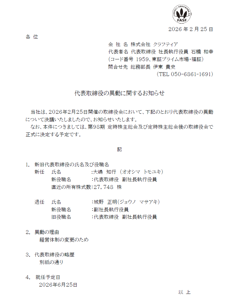 株式会社クラフティア(福岡市中央区天神)は2026年2月25日、同日開催の取締役会で取締役の異動を決議したと公表しました。公表時刻は15時06分で、異動の具体的な氏名や人数などは現時点で本文から確認できません。