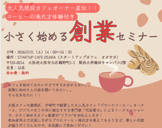 大阪府商工会連合会は2月21日14時から、スタートアップカフェ大阪(関西大学梅田キャンパス内)で、コーヒーの淹れ方体験を組み込んだ「小さく始める創業セミナー」を開きます。参加は先着10人です。カフェ創業や副業起業の不安を減らし、実践の要点を学ぶ場とします。