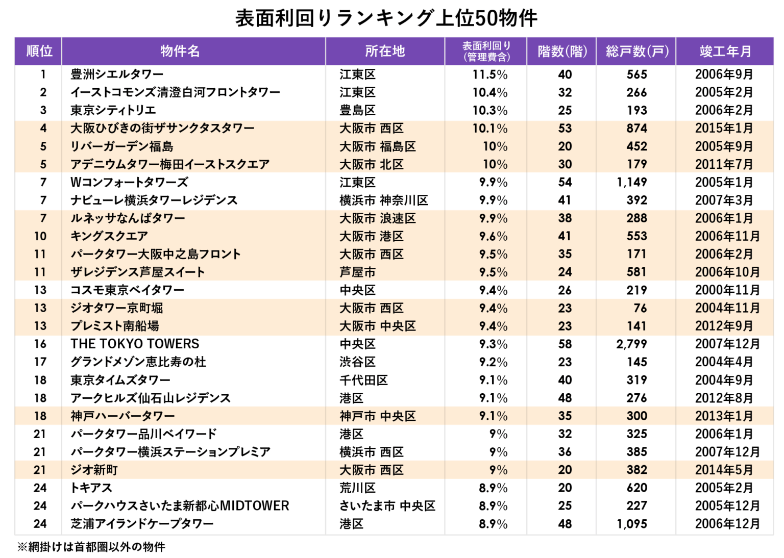 エリア別では、1・2位は東京23区湾岸の江東区でしたが、ランキング内で最多は大阪市西区の8物件でした。大阪市全体では7区20物件が上位入りし、利回りの高い物件は大都市の都心部に分散していることが分かります。竣工年は2005~2007年完成が中心で、上位物件の約6割が築20年前後、最も新しい物件でも2015年竣工と築10年でした。新築価格が比較的低かった時期に購入したタワーマンションは、現在貸し出しても高い利回りを得やすい傾向がうかがえます。