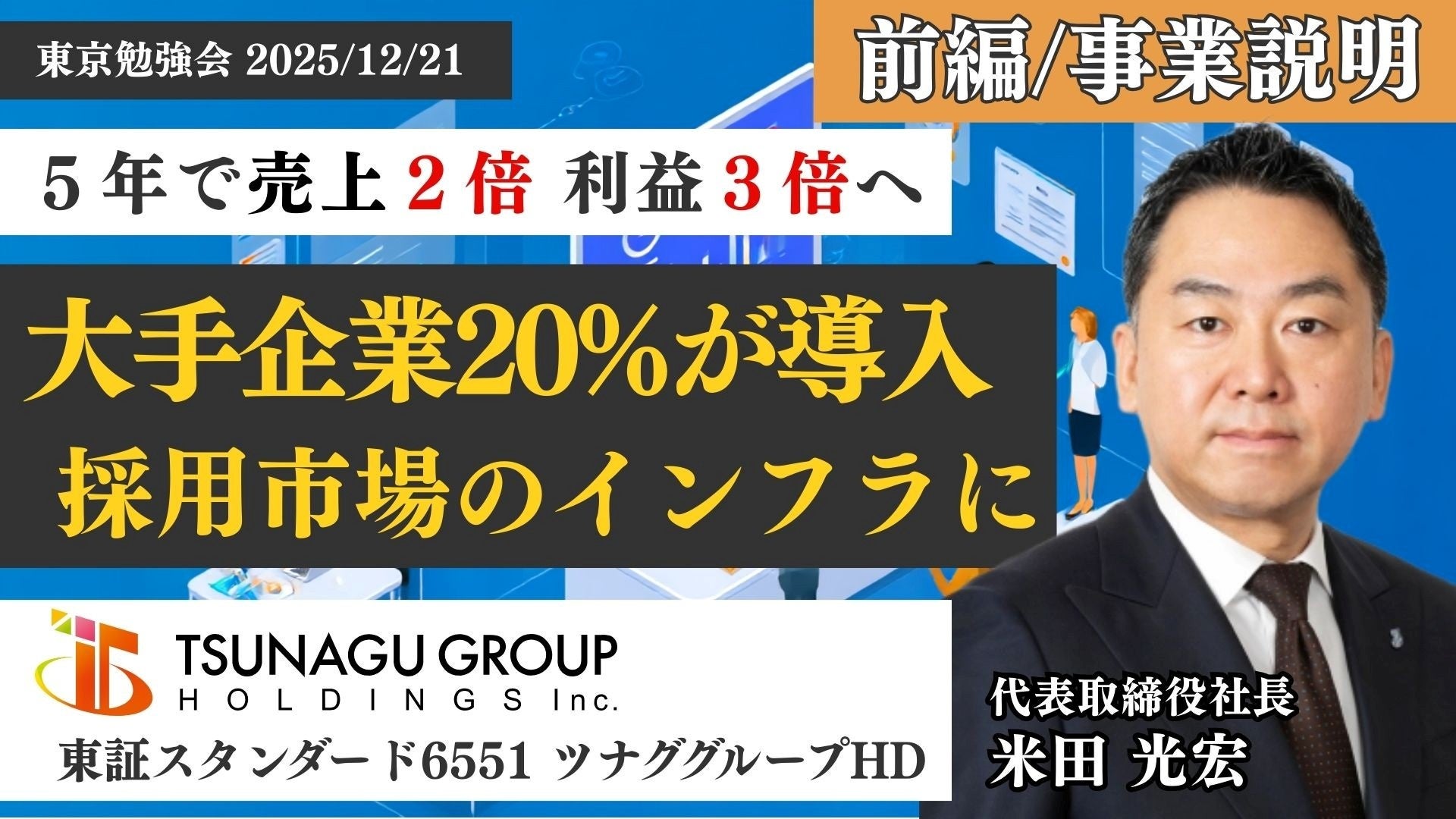 ツナググループ・ホールディングス(東証スタンダード、6551)は、2025年12月21日12:00~17:00に開催された個人投資家向けIRセミナー「東京勉強会」での登壇内容を、アーカイブ動画としてYouTubeに公開しました。動画は前編・後編の2本です。