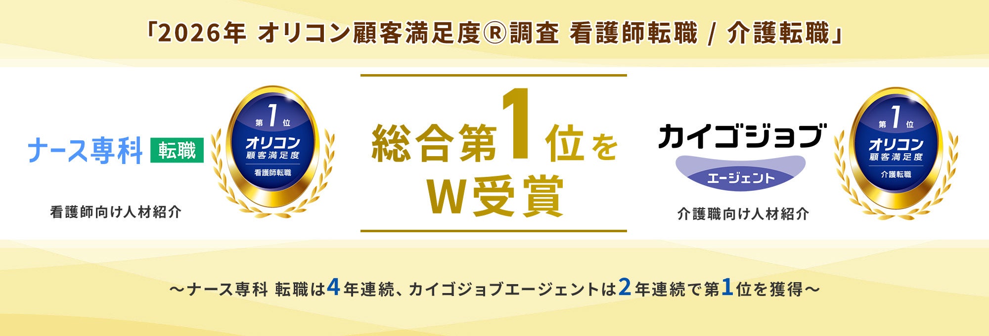 エス・エム・エス(東京都港区)の看護師向け人材紹介「ナース専科 転職」と介護職向け「カイゴジョブエージェント」が、オリコン顧客満足度調査2026の「看護師転職」「介護転職」両ランキングで総合1位となりました。ナース専科 転職は4年連続、カイゴジョブエージェントは2年連続の首位です。