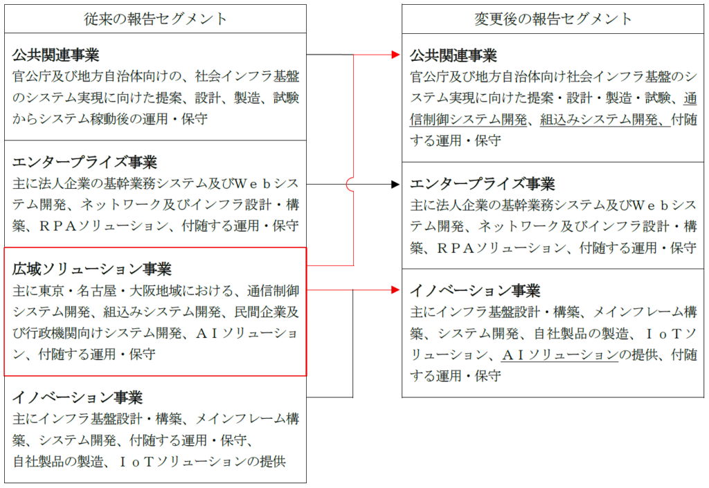 新たな区分は「公共関連事業」「エンタープライズ事業」「イノベーション事業」の3つです。これまでの「公共関連事業」「エンタープライズ事業」「広域ソリューション事業」「イノベーション事業」という4区分から、「広域ソリューション事業」を含めた形で再整理します。