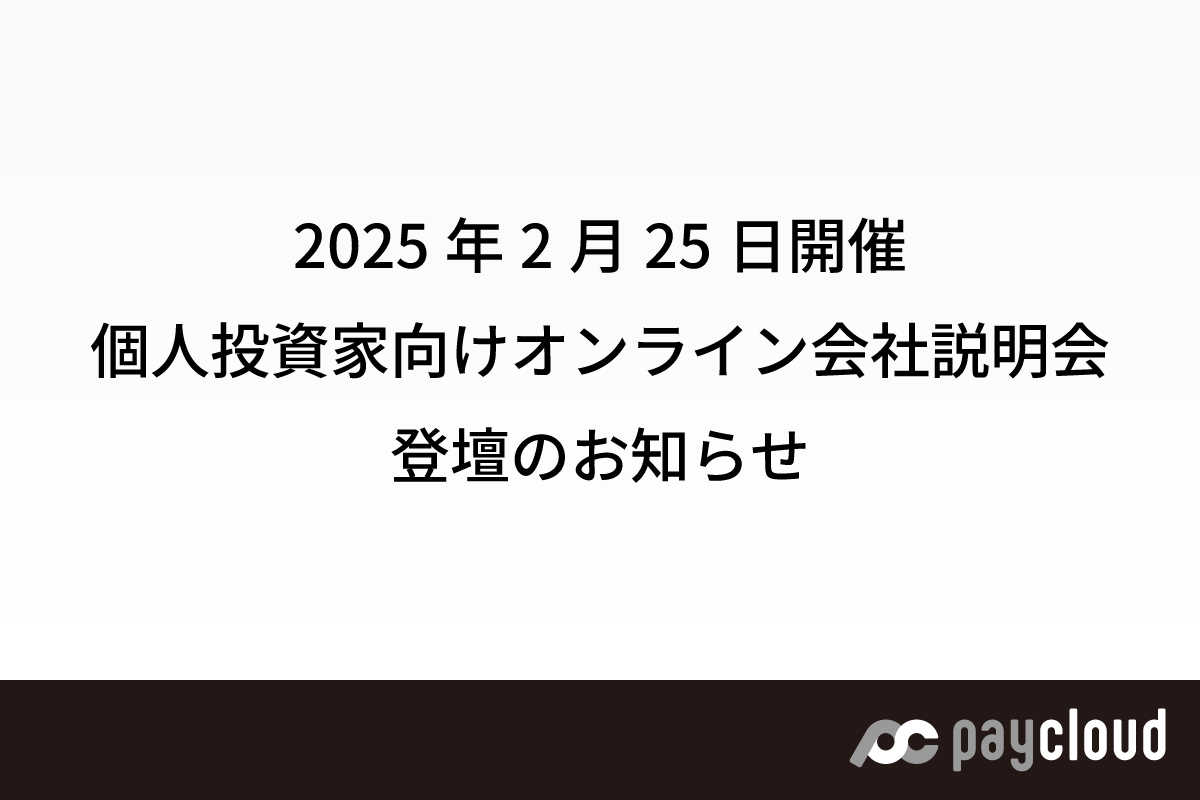 ペイクラウドホールディングス(東京都港区)は2026年2月25日17時から、マネックス証券が運営する個人投資家向けオンライン会社説明会に、執行役員 副社長の井上浩毅氏が登壇します。参加費は無料で、事前申込は不要です。