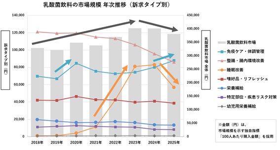 分析では、乳酸菌飲料の市場規模が2020年から3年間で15%増加した一方、「整腸・腸内環境改善」訴求の商品は2018年から7年間で金額シェアが14%減少しました。代わって「免疫ケア・体調管理」訴求が堅調で、値上げが続く環境下でも需要が下支えされているとしています。