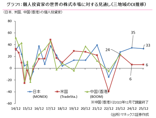 マネックス証券が口座保有者743人の回答を集計した2025年12月調査で、今後3カ月の株式見通しDI(上昇割合-下落割合)は日本33(前年差-2)、米国6(±0)と、日米とも概ね横ばいでした。上昇が期待できる地域は日本の投資家で米国60.2%、日本32.6%、米国の投資家でも米国85.9%が最多です。