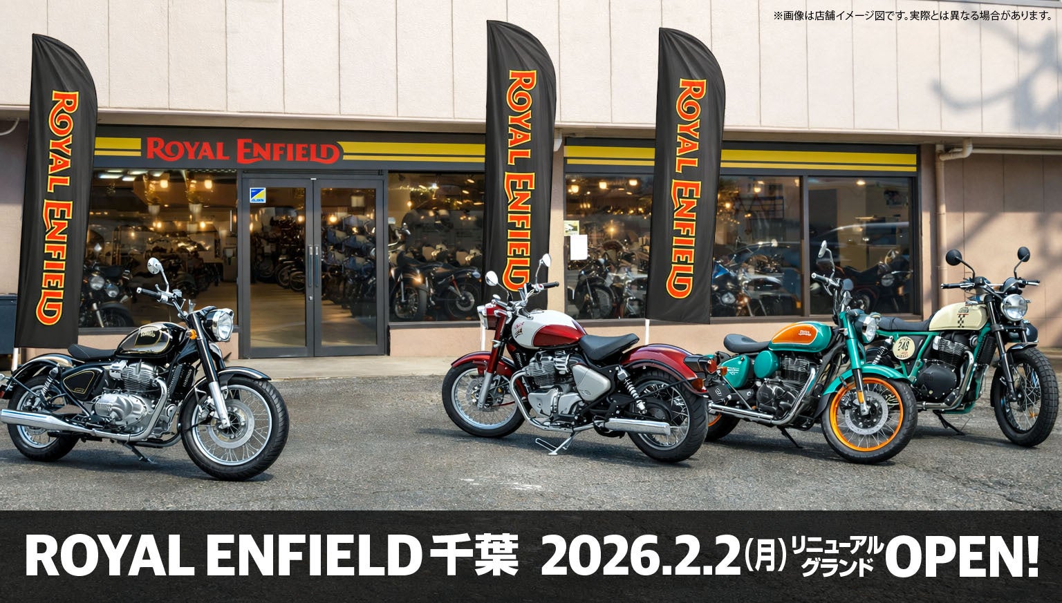 ロイヤルエンフィールドの正規ディーラー「ロイヤルエンフィールド 千葉」(千葉県八千代市)が、2026年2月2日(月)にリニューアルグランドオープンします。運営は松戸市の株式会社クロニクルで、最新ショールームコンセプトを導入し、展示・物販・整備を一体で提供します。場所は京成バラ園近くの米本街道沿いで、東葉高速線「八千代中央駅」から徒歩約1.3kmです。店内には「CLASSIC 650」「GOAN CLASSIC 350」「CLASSIC 350」など計11モデルを展示予定で、純正アクセサリーと純正アパレルの専用コーナーも設けます。さらに併設のサービス工場で点検・整備などのアフターサービス体制を強化します。国内ネットワークは発表時点で正規ディーラー45店舗、サブディーラー6店舗の計51店舗とされ、同ブランドは今後もサービス提供体制の拡充を進める見通しです。