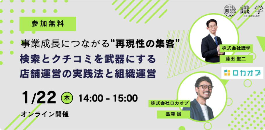 店舗集客の成果を安定させる方法を学べる無料オンラインセミナーが、2026年1月22日14時から15時に開かれます。主催はロカオプと識学で、Zoomを使い参加費は無料です。テーマは検索(主にGoogleマップ)とクチコミを軸にした「再現性の集客」で、集客の波や属人化を抑える実践法を扱います。内容は、ロカオプが現場知見を基にGoogleマップ対策(MEO)やクチコミ活用の店舗運営を事例付きで解説し、識学がマネジメント理論「識学」を踏まえ、成果を個人依存にしない仕組み化の組織運営を紹介します。登壇は識学の上席コンサルタント藤田聖二氏と、ロカオプ戦略マーケティング部長の島津誠氏。集客に課題を感じる経営層や担当者が対象で、店舗運営と組織運営をセットで見直す機会になりそうです。今後は、検索とクチコミの運用を継続できる体制づくりが、地域店舗の成長を左右すると見られます。【イベント情報】