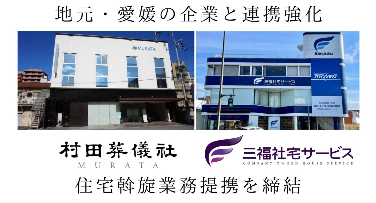 支援内容は、愛媛県内全域での賃貸住宅紹介に加え、社宅規定に沿った物件提案、取引条件の協議対応、物件資料の迅速な提供など。対象は村田葬儀社に勤務する社員およびその家族で、ライフステージの変化に伴う転居ニーズを想定する。