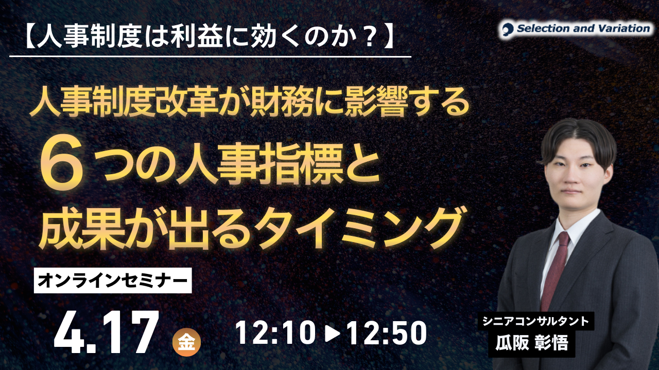 セレクションアンドバリエーションは2026年4月17日12時10分〜12時50分、オンライン(Zoom)で「人事制度は利益に効くのか?」をテーマにしたセミナーを開きます。人事制度改革が財務に影響する「SV6指標」と、成果が出るタイミングを解説し、参加費は無料です。