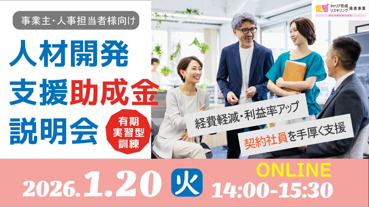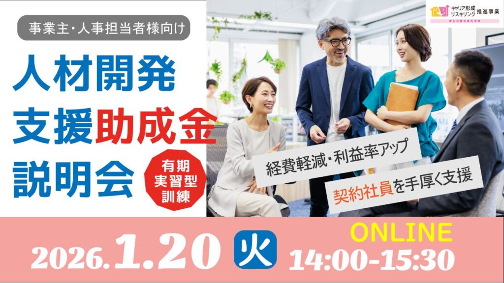 企業の人事担当者向けに、人材開発支援助成金の「有期実習型訓練」を解説するオンライン説明会が2026年1月20日14時から15時30分まで開かれます。定員は50人、参加費は無料で、申込期限は1月19日23時59分です。主催は厚生労働省委託事業「キャリア形成・リスキリング推進事業」の運営を担うパソナです。説明会では、訓練実施に対して訓練経費や訓練期間中の賃金の一部などを助成する制度の概要に加え、申請時に間違いやすい書類の記入ポイント、申請に必要となるジョブ・カード(職務経歴や学習歴を整理する様式)の書き方を扱います。有期実習型訓練の活用により、パート・アルバイトなど非正規雇用の適性や能力を見極めた上で正社員登用につなげたり、能力向上と職場定着を促したりする効果が見込まれるとしています。今後は、助成金を活用したリスキリング需要の高まりを背景に、申請実務の理解を深める場として同様の説明機会が増える可能性があります。
