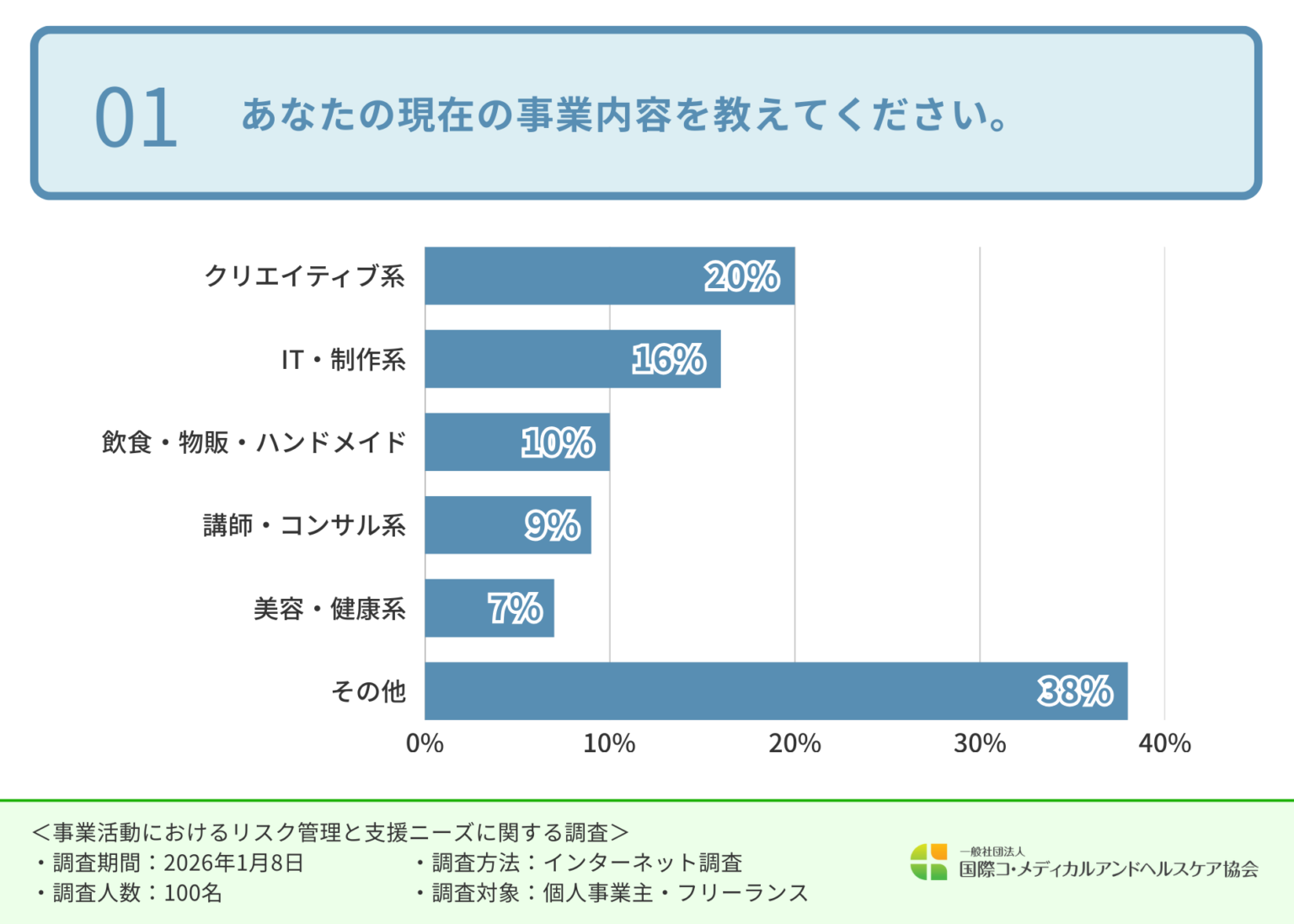 調査は2026年1月8日、一般社団法人国際コ・メディカルアンドヘルスケア協会(神奈川県川崎市)が実施しました。回答者の業種はクリエイティブ系20%、IT・制作系16%、飲食・物販・ハンドメイド10%など多様で、「その他」は38%でした。個人で事業を回す働き方では、賠償責任や契約問題が発生した際に法務対応の負担が大きく、損失が事業継続に直結しやすい点が課題です。