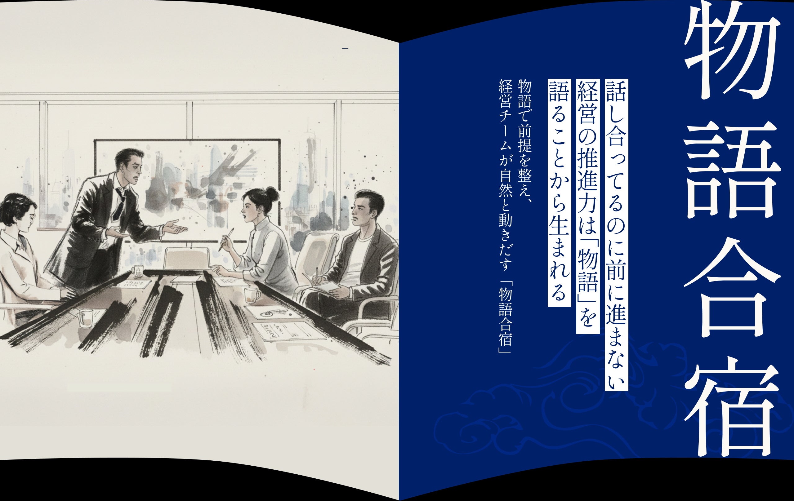 『物語合宿』は、経営者・経営陣・意思決定に関わる中核メンバーが参加し、自社の物語(自社が何者で、どこへ向かうか)と各人の役割を言葉にして持ち寄り、擦り合わせる設計です。結論を急ぐよりも、進まない原因となる本音や避けてきた論点を場に出し、組織が再び動ける状態をつくることを目的に据えています。設計から当日のファシリテーションまで一貫して支援し、提供地域は全国対応です。