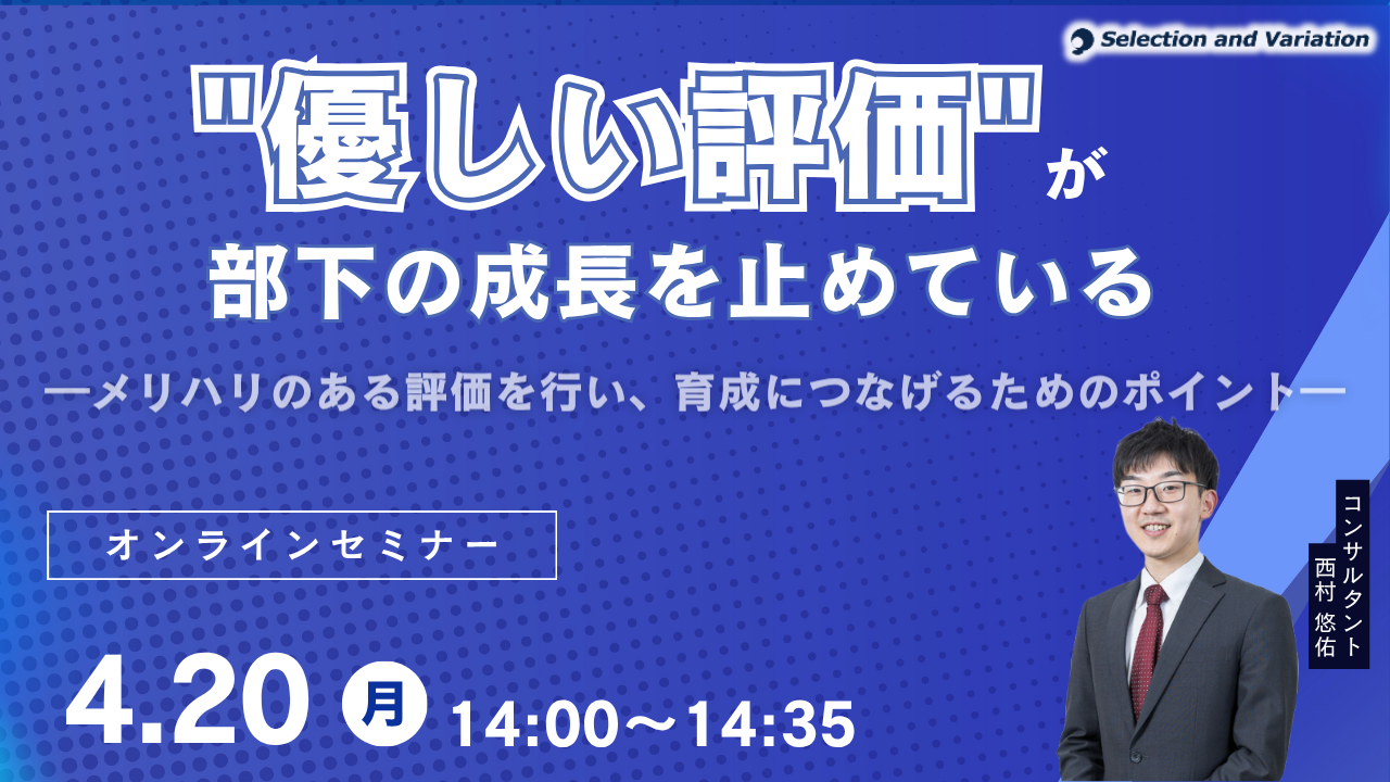 セレクションアンドバリエーション(東京都千代田区)は2026年4月20日14時から14時35分まで、評価が甘くなる・中心化する課題を扱うオンラインセミナー「“優しい評価”が、部下の成長を止めている」をZoomで開催します。参加費は無料で、登壇は西村悠佑氏です。