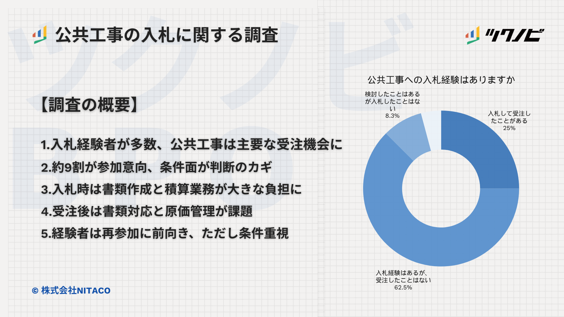 NITACOは2026年2月27日、建設業従事者246名へのWEBアンケート(2月18日〜25日)で、公共工事の入札に関する負担や受注後の課題、参加意向を公表しました。公共工事の入札で「受注したことがある」は約52%でした。
