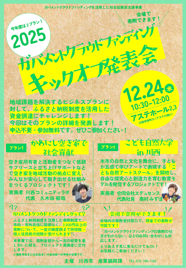 兵庫県川西市は12月24日10時30分~正午、アステ市民プラザ(アステホール2・3)で、地域課題解決を狙う2つのビジネスプラン発表会を開き、同日からガバメントクラウドファンディング(ふるさと納税を活用した寄付制度)による資金調達を始めます。入場は無料で事前申込は不要です。公募は令和7年5~6月に実施され、応募4件から審査で2件が選ばれました。発表されるのは、空き家所有者と活動者をつなぐ低額サブリース等で地域活動拠点を増やす「かわにし空き家で社会貢献」と、自然と文化を題材に子どもが五感で学び表現する「こども自然大学 in 川西」です。寄付は市内外を問わず2,000円以上で税控除の対象(上限あり、申告が必要)となり、寄付額から一定経費を除いた金額が実施者に交付されます。当日は会場で現金寄付も受け付け、立ち上げ支援の進捗が焦点になりそうです。