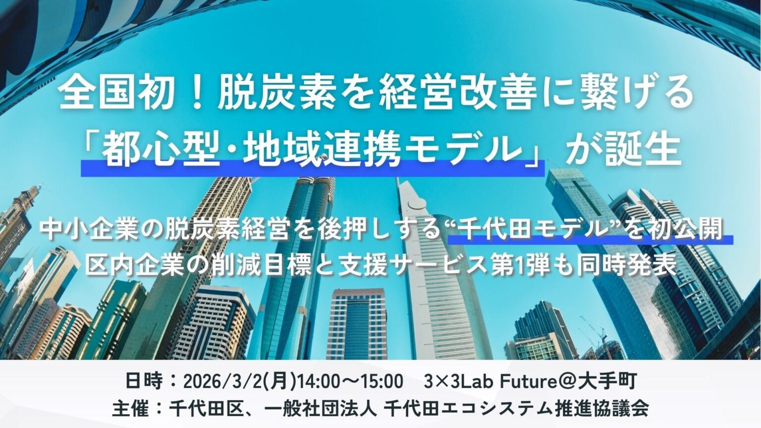 千代田区は2026年3月2日、全国初の都心型・地域連携モデル「千代田モデル」の発足を宣言し、「ちよエコ未来企業スクール」参加企業のCO₂削減目標を公開する。あわせて中小企業向けの脱炭素支援サービス・製品の第1弾を、1時間の記者会見で発表する。会場は大手町の3×3Lab Future。