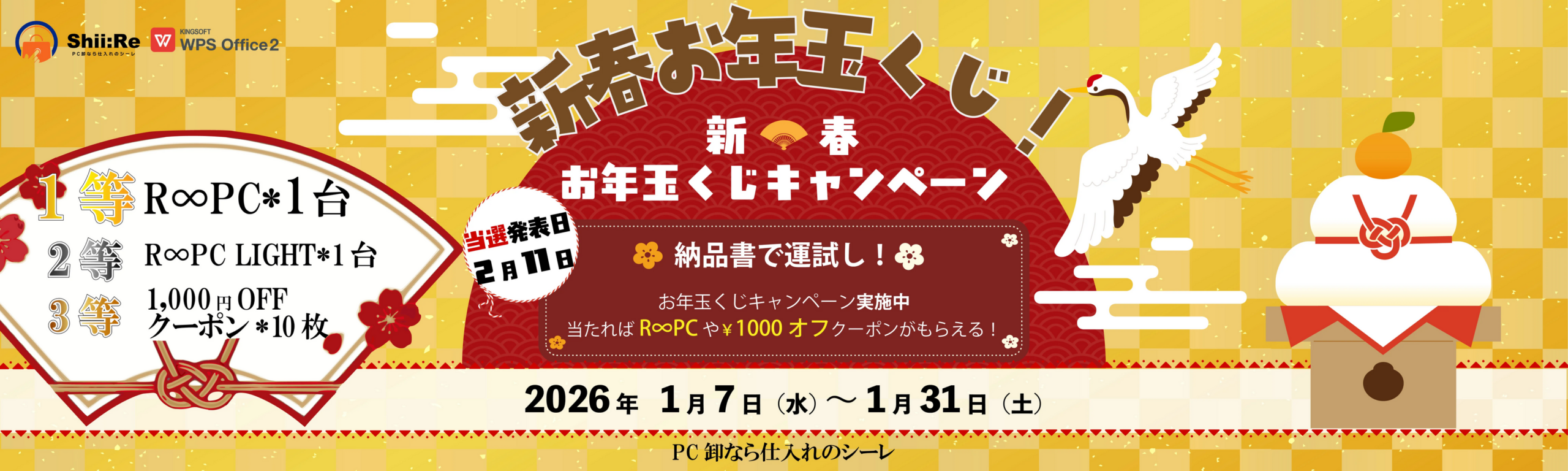 リングロー(東京都豊島区)は、卸業者向け会員制ECサイト「Shii:Re(シーレ)」で、2026年1月7日~1月31日にパソコン購入者を対象とした「新春お年玉くじキャンペーン」を実施します。購入PCの納品書に印字される「くじ番号」で抽選し、当選は2月11日に同サイトで発表します。景品は1等1名にR∞PC無期限保証モデル(A4)、2等1名にR∞PCライトモデル(A4)、3等10名に1000円OFFクーポン(有効期限は2026年3月末)です。くじ番号はPC1台につき1つ付与されます。Shii:Reは「仕入れ」を由来とする名称で、1台から卸値で購入でき、会員登録後に価格を確認できる仕組みです。利用は古物商許可番号を持つ事業者に限られます。R∞PCは保証期間を選べる中古PCブランドで、電話やLINEの相談サポートを無期限・無制限で利用できる点を特徴とします。年始の販促需要が高まる時期に、卸取引の活性化とリユースPCの流通拡大につながるかが注目されます。【キャンペーン情報】