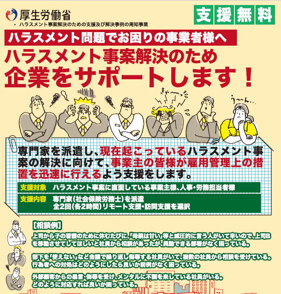 職場で起きたハラスメント事案の解決を後押しするため、厚生労働省委託事業として、専門家の社会保険労務士が事業主や人事・労務担当者を無料で支援します。支援は全2回で各2時間、リモートまたは訪問のいずれかを選べます。事務局は株式会社タスクールPlusです。