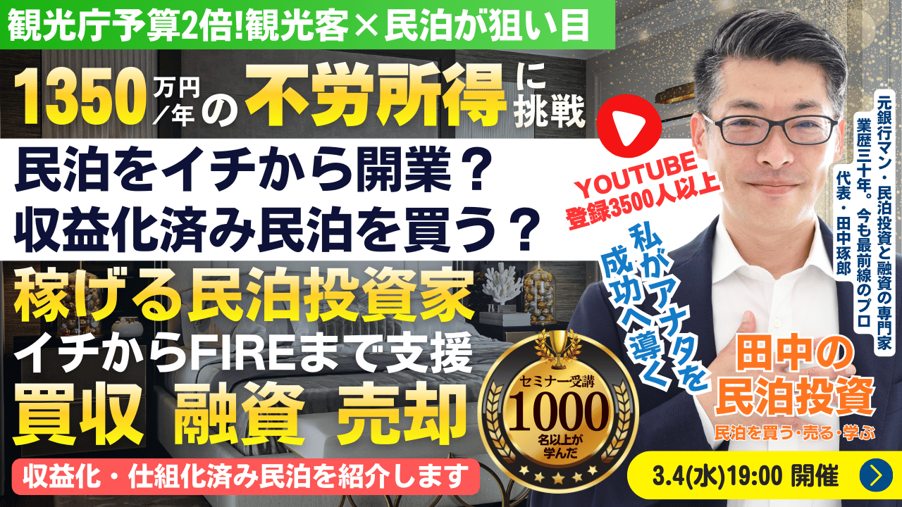 3/4(水)民泊セミナー。民泊開業vs収益化済み民泊を買う!FIREするなら現実的なのはどっち?年間1,350万円を目指す民泊投資家を育成。『稼げる民泊YouTube』登録者3500人以上の元銀行マン