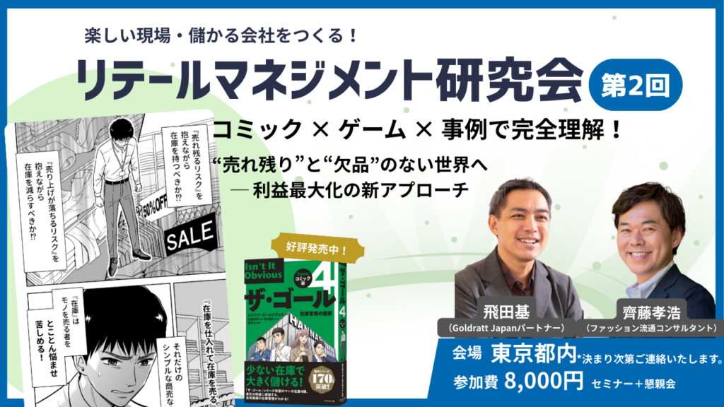 株式会社Goldratt Japanは2026年2月4日、アパレル・小売業のマネジメント層向けイベント「リテールマネジメント研究会」第2回を東京・渋谷の東京カルチャーカルチャーで開きます。定員は50人、参加費は8,000円で、在庫運用が利益と現場に与える影響を、対談と体験型プログラムで扱います。