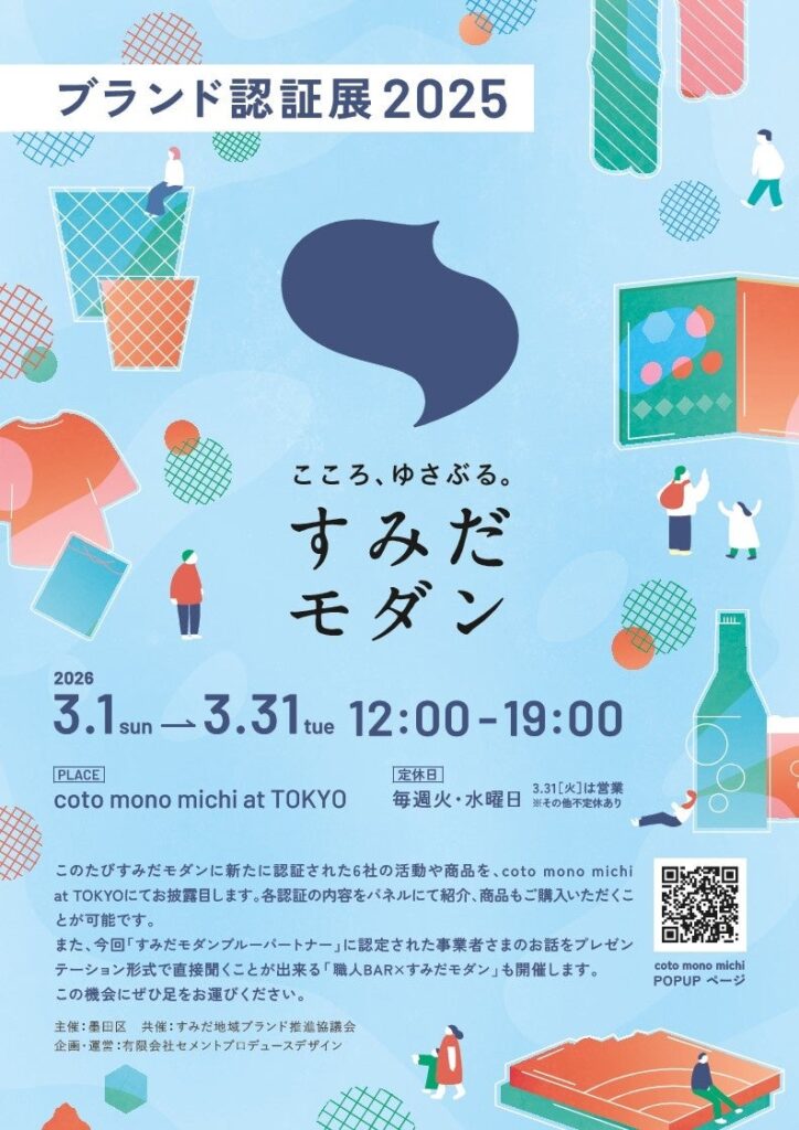 東京都墨田区は、2025年度に新たに認証された「すみだモダン」の活動や商品を紹介・展示し、購入もできる「すみだモダン2025ブランド認証展」を2026年3月1日~31日に開きます。会場はcoto mono michi at tokyo(墨田区業平)で、営業時間は12:00~19:00です。