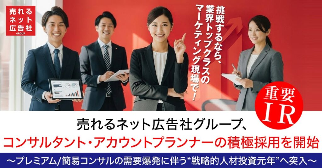 売れるネット広告社グループ(東証グロース、9235)の連結子会社・売れるネット広告社は、2025年12月3日、コンサルタントとアカウントプランナーの積極採用を開始しました。プレミアムコンサルティングと、先週立ち上げた簡易コンサルティングの需要が想定比2倍のペースで拡大し、対応能力の引き上げが急務になったためです。同社のノウハウは2,600回以上のA/Bテストに基づくとされ、デジタル広告市場の年率10%超の拡大、国内D2C市場の数千億円規模という追い風も背景にあります。