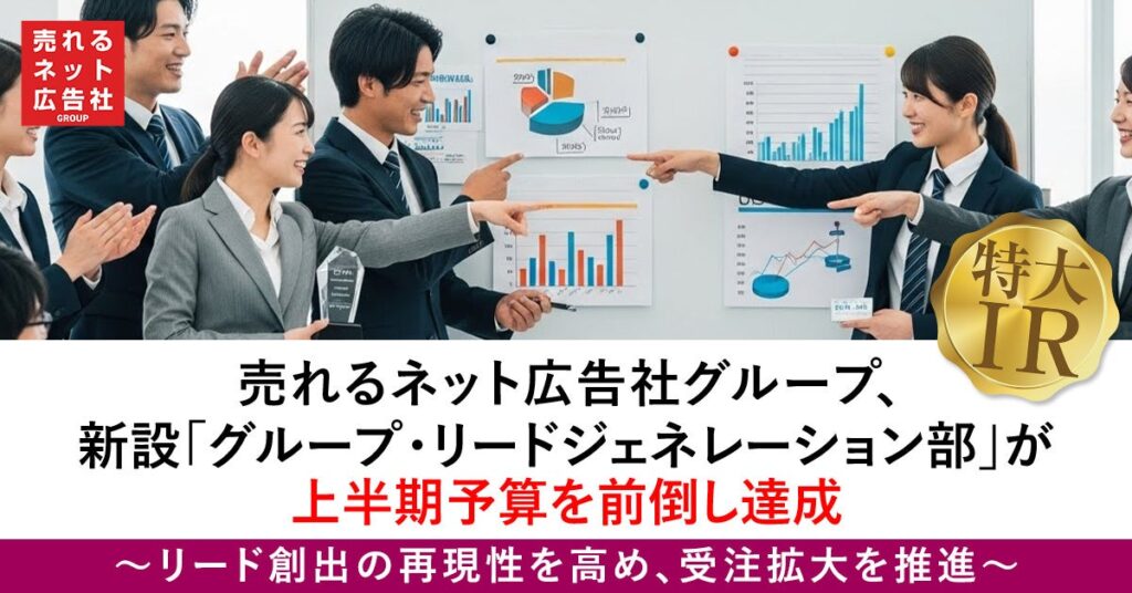売れるネット広告社グループの連結子会社・売れるネット広告社は、新設した「グループ・リードジェネレーション部」が上半期予算の商談設定数250社を前倒しで達成し、上半期見込みを280社へ上方修正しました。いつ、2025年10月に設置した同部門が、設立から約2カ月で120社超の新規商談を設定したことが背景です。部門は広告運用やクリエイティブ、CRM(顧客管理)やデータ活用を統合し、グループ各社へ案件を安定供給する役割を担うといいます。リード(見込み客)獲得の仕組み化により、個人依存ではなく再現性を高めた点を特徴に挙げています。またコスト構造が比較的固定的なため、リード・商談の増加が利益率改善につながりやすいと説明しました。なお今回の上方修正が連結業績に与える影響は軽微としつつ、2026年7月期の連結業績へのプラス寄与を見込むとしています。今後はAI活用によるリード創出の高度化や、SaaS、広告、CRM、越境EC領域への展開強化を進める方針です。