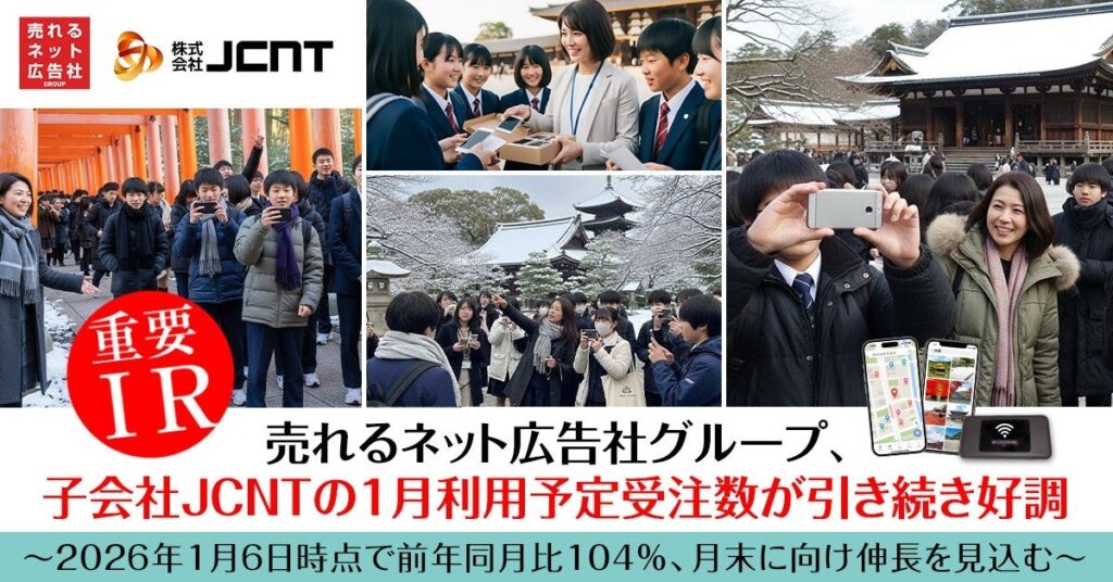 売れるネット広告社グループの連結子会社JCNTで、2026年1月の利用予定受注数が伸びています。1月6日時点で前年同月比104%となり、直前申込が多い需要特性から、1月末には前年同月比120%程度に達する見込みです。好調の背景として同社は、昨年投入した新商品の効果と、営業活動による認知拡大が申込増に寄与したとの見方を示しています。対象期間は季節要因で需要が落ち着きやすい局面としつつ、今回の動向が受注シェア拡大や業界内でのポジション強化につながる可能性があると位置づけました。運営面では需要予測の精度を高め、端末の計画調達や配送体制の最適化、調達コスト低減、繁忙期オペレーションの平準化、欠品リスク抑制を進める方針です。サービス品質では導入前説明の標準化とサポート体制強化でキャンセル率低下、問い合わせ一次解決率の向上を狙います。連結業績への影響は現時点で軽微としつつ、2026年7月期にはプラス寄与を見込むとしています。今後は前倒し申込の促進や、教育旅行事業者・学校との共同プロモーション、申込から変更・進捗確認までを一括で行えるオンライン機能の拡張を予定しています。