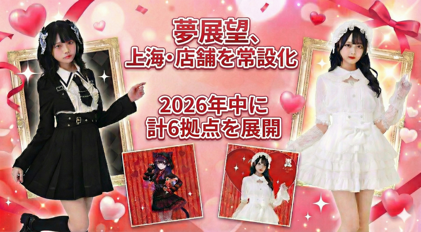 夢展望は2026年4月から上海・五角城エリアの店舗を常設化し、中国での実店舗展開を加速します。同社の上海POP-UPは純売上が2025年12月の196,904元から2026年1月に232,092元へ伸び、前月比約18%増でした。2026年2月第1週時点の売上は50,614元、客単価は575元です(1元=約20円換算)。