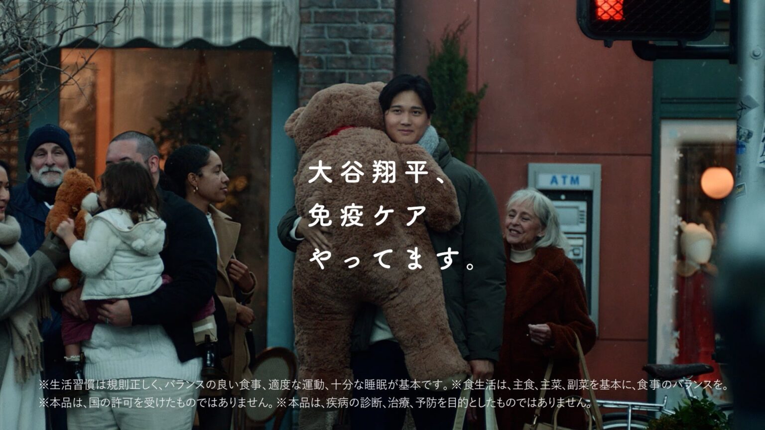 CMは雪の降る街で、大谷選手が大きなくまのぬいぐるみを抱えた女の子に手を振る場面から始まり、家族ができたことで体調管理への意識が変わった心境を語ります。「信じられるものしか選べない」として商品を訴求し、「大谷翔平、免疫ケアやってます。キリンのプラズマ乳酸菌。家族の健康を守る発明です。」のセリフで締めます。メイキングでは、子どもに目線を合わせてほほえむカットなど撮影現場の様子を収録しています。