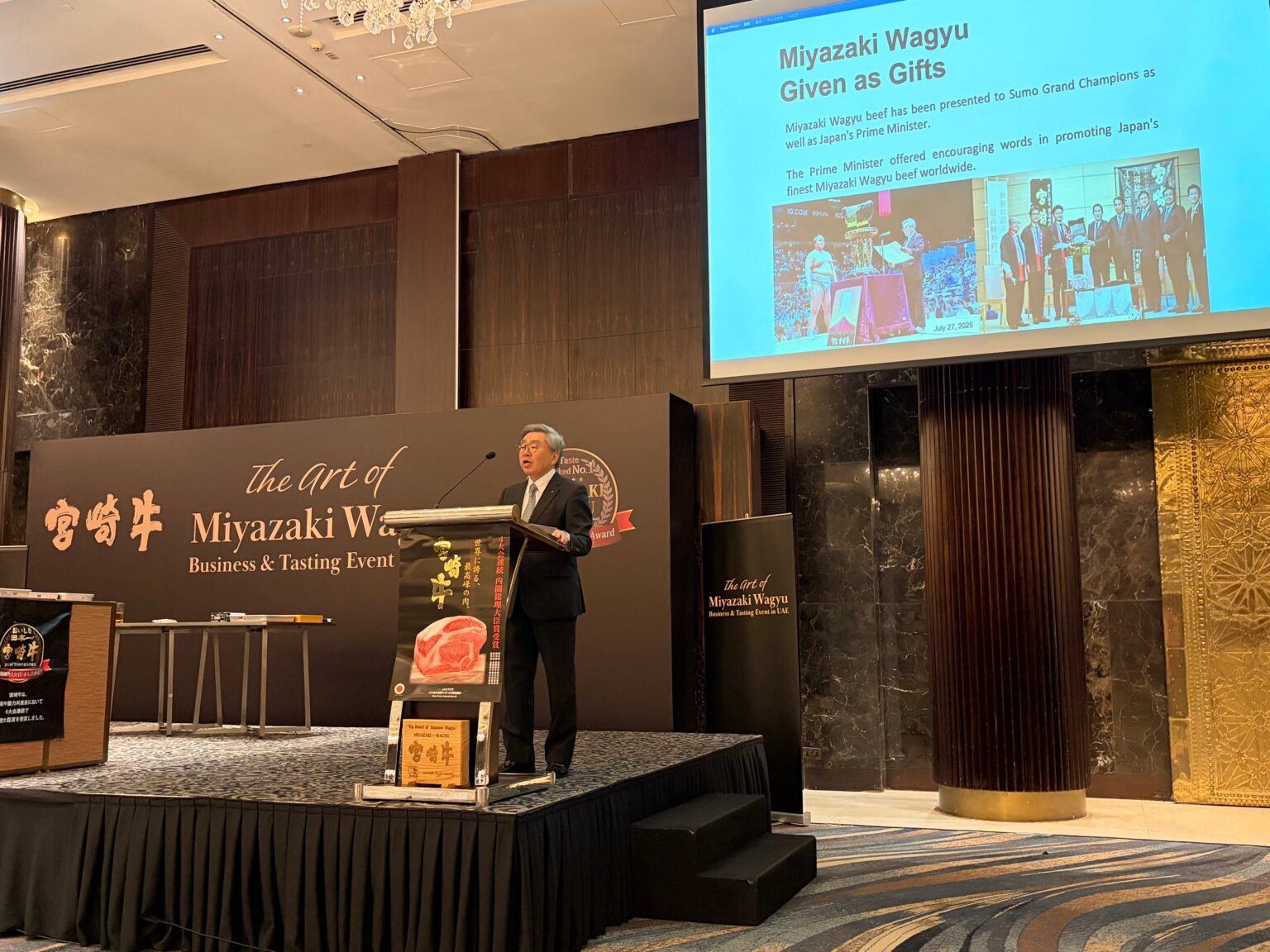 宮崎県は2026年1月23日(現地時間)、UAEドバイ市内の高級ホテルで宮崎牛のレセプションを開きました。現地バイヤーや飲食店関係者、シェフなど約100名が参加し、試食と商談の場を設けました。