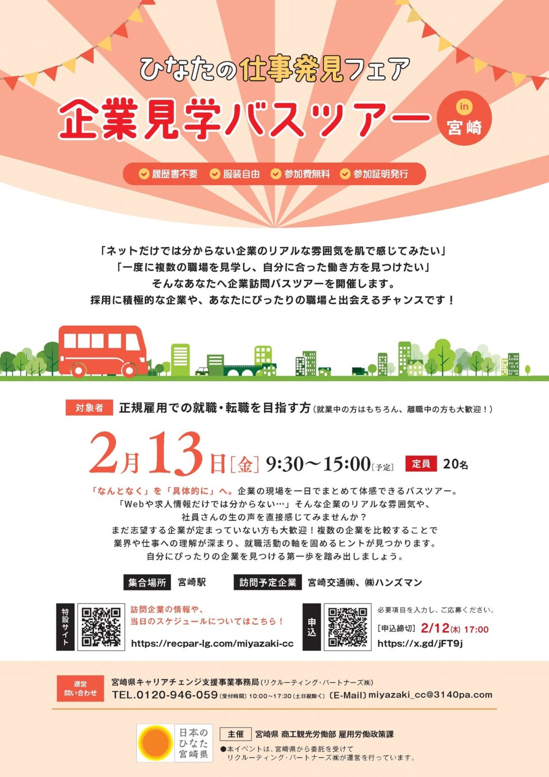 宮崎県は、正規雇用での就職・転職を目指す人を対象に、イベント「ひなたの仕事発見フェア~企業見学バスツアー&マッチングフェア~」の参加者を募集している。第1弾の企業見学バスツアーは2026年2月13日9時30分~15時30分、第2弾のマッチングフェア(合同企業説明会)は2月21日13時~16時に開く。