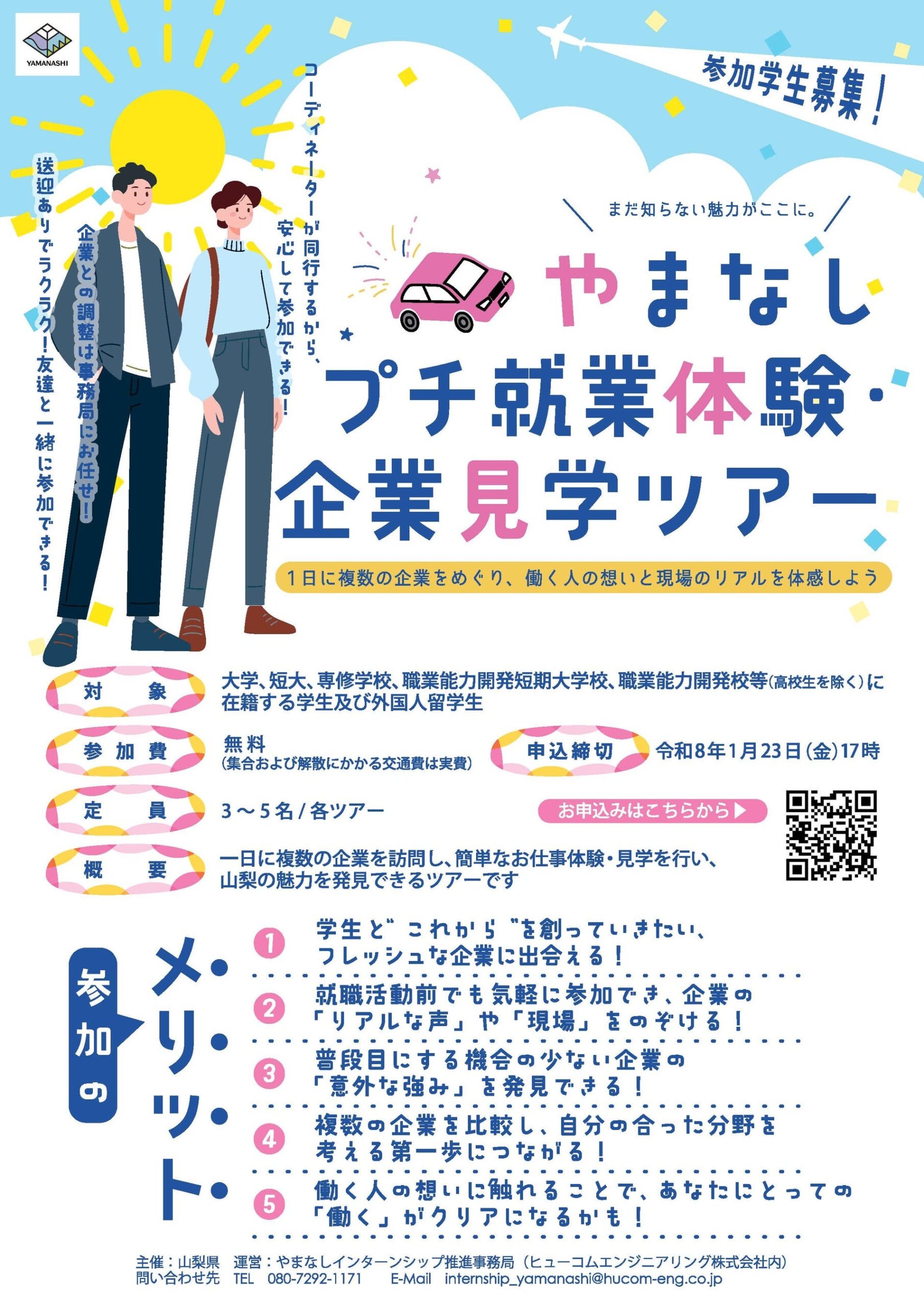 山梨県は、県内企業を1日で複数訪問して簡単な仕事体験や職場見学ができる「春のやまなしプチ就業体験・企業見学ツアー」を、令和8年2月18日〜3月5日に全6回開催します。参加費は無料で、集合は指定の最寄り駅からです(駅までの交通費と食費は自己負担)。