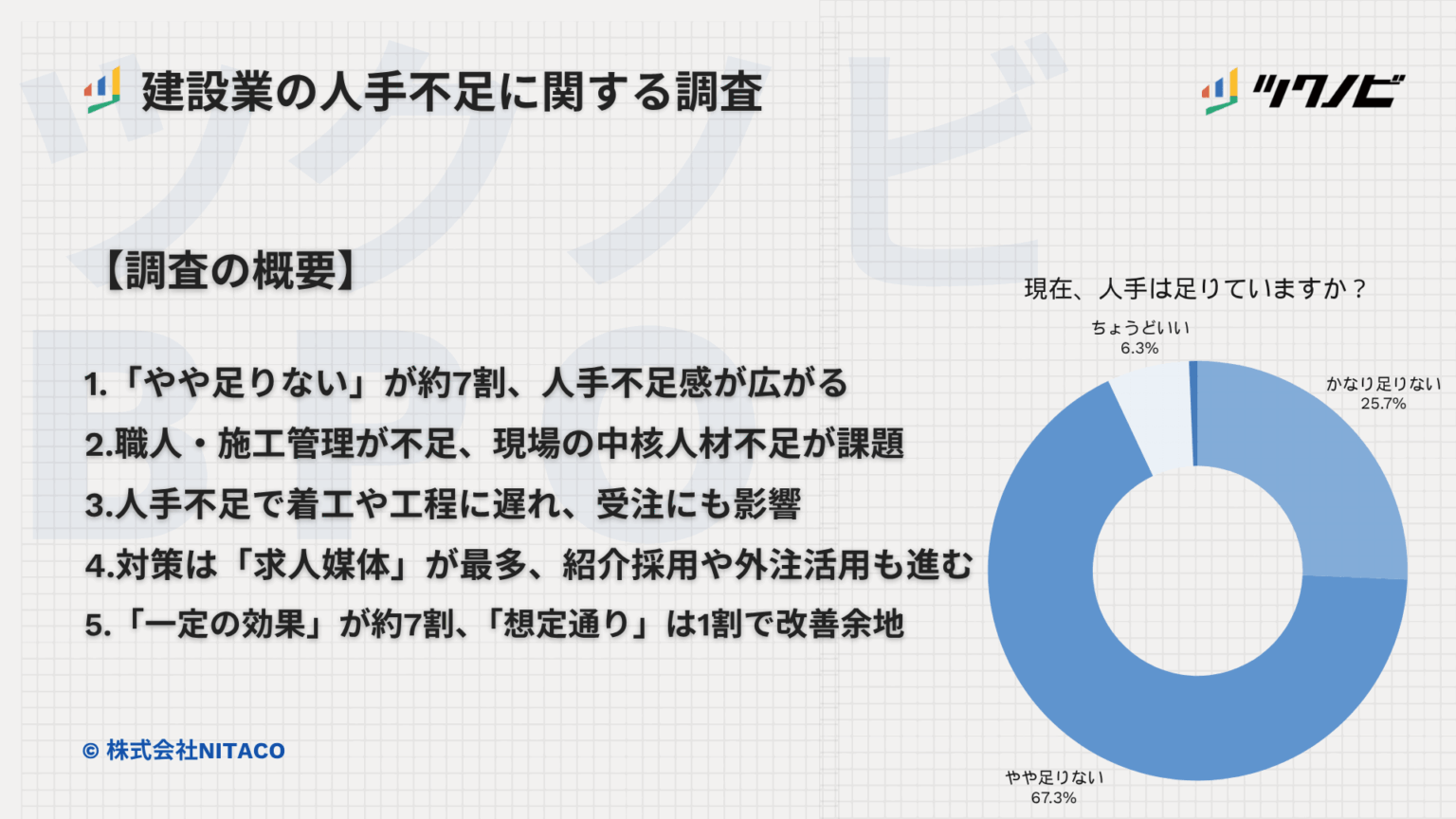 東京都渋谷区の株式会社NITACOは2026年3月24日、建設業従事者300名へのWEBアンケート結果を公表しました。人手の状況は「やや足りない」67.3%、「かなり足りない」25.7%で、計93.0%が不足と回答しました(調査期間:2026年3月2日〜3月16日)。