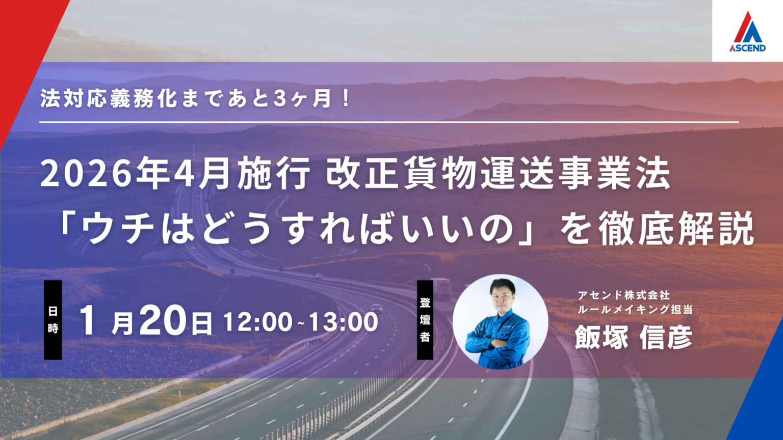 アセンド(東京都新宿区)は、2026年4月に施行予定の改正貨物自動車運送事業法について、実務対応を整理する無料オンラインセミナーを2026年1月20日12時から開催します。2025年12月の同テーマ回には約350人が申し込み、施行まで約3か月に迫ったことから再開催を決めました。対象は元請け事業者や一般貨物運送事業者です。
