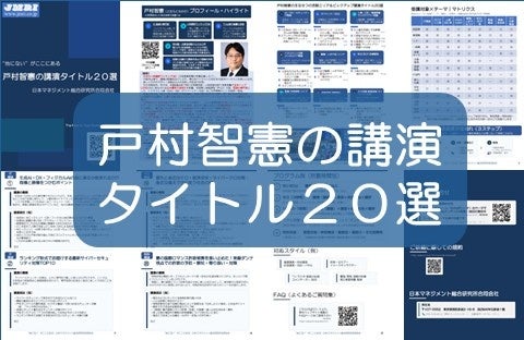 日本マネジメント総合研究所(東京都港区)は2月4日16時50分、理事長の戸村智憲氏による「戸村智憲の講演タイトル20選」2026年版をPDF冊子(全16ページ)として公開し、2026年度向けの講演ラインナップ20タイトルを案内した。講演・研修・セミナー主催者からの依頼相談は専用フォームで受け付ける。