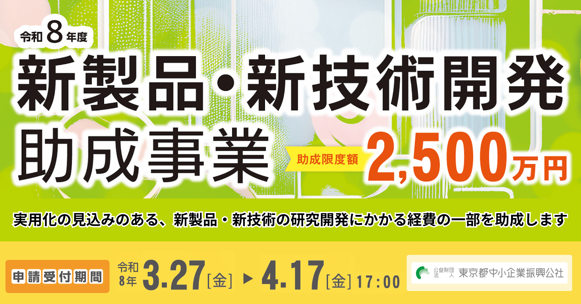 東京都中小企業振興公社(東京都千代田区)は2月23日、都内の中小企業者などを対象に、新製品・新技術の研究開発費の一部を助成する「新製品・新技術開発助成事業」の募集開始に先立ち、募集要項を公開しました。助成限度額は2,500万円、助成率は通常1/2以内です。