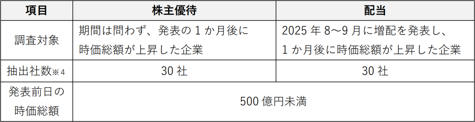 調査は、株式会社デジタルプラスが保有する株主優待導入データと公開情報を用いて、時価総額500億円未満の上場企業を中心に実施しました。その結果、株主優待企業の投資対効果は配当増額企業の2.2倍となり、市場区分別でもグロース市場で2.5倍、スタンダードで2.3倍、プライムでも1.5倍と、いずれも株主優待が上回る傾向が確認されました。特に個人投資家比率が高いとされる時価総額500億円未満の企業では、優待の有無が投資判断に直結しやすく、新規の個人投資家を呼び込みやすい構造が優位性の背景にあると分析されています。