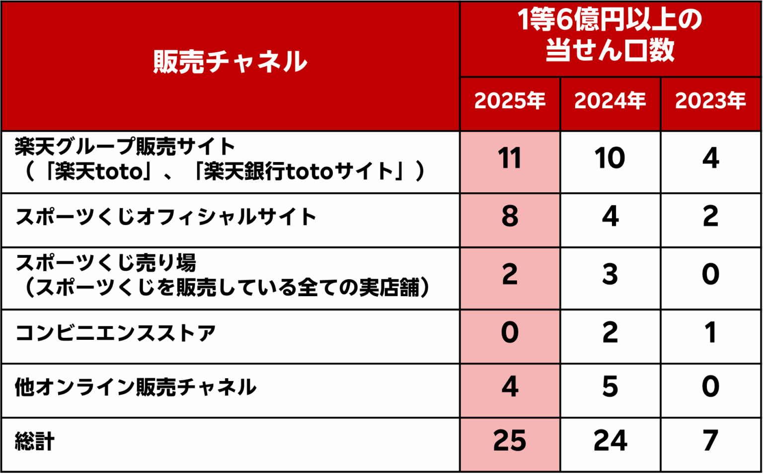 楽天グループの「楽天toto」と楽天銀行の「楽天銀行totoサイト」は、スポーツくじ「BIG」における1等6億円以上の当せん口数で、国内の販売チャネル別年間順位が2013年から2025年まで13年連続で1位となりました。2025年は「BIG」1等6億円以上の当せんが全体25口、当せん金合計約162億円だったのに対し、両サイト経由は合計11口、当せん金合計約72億円で、4割超を占めています。両サイトは「BIG」「toto」「WINNER」などを取り扱い、利用者の購入機会を広げてきました。「BIG」は指定試合の結果をコンピュータが自動選択する仕組みで、通常の1等最高額は3億円ですが、繰り越しが発生するキャリーオーバー時などに最高6億円となります。また、最高額未満も含む「BIG」1等当せん口数の年間実績でも、「100円BIG」(1口100円、1等はキャリーオーバー時に最高2億円)を含めて9年連続で年間1位となりました。スポーツくじ収益は選手育成や大会開催、施設整備などの助成財源に充てられており、販売動向はスポーツ振興の資金面にも影響します。楽天銀行は今回の実績を受け、「BIG」1口が当たるキャンペーンを実施しており、今後はオンライン販売の利便性向上や利用者層の拡大が、販売シェアの変動要因となりそうです。【キャンペーン情報】