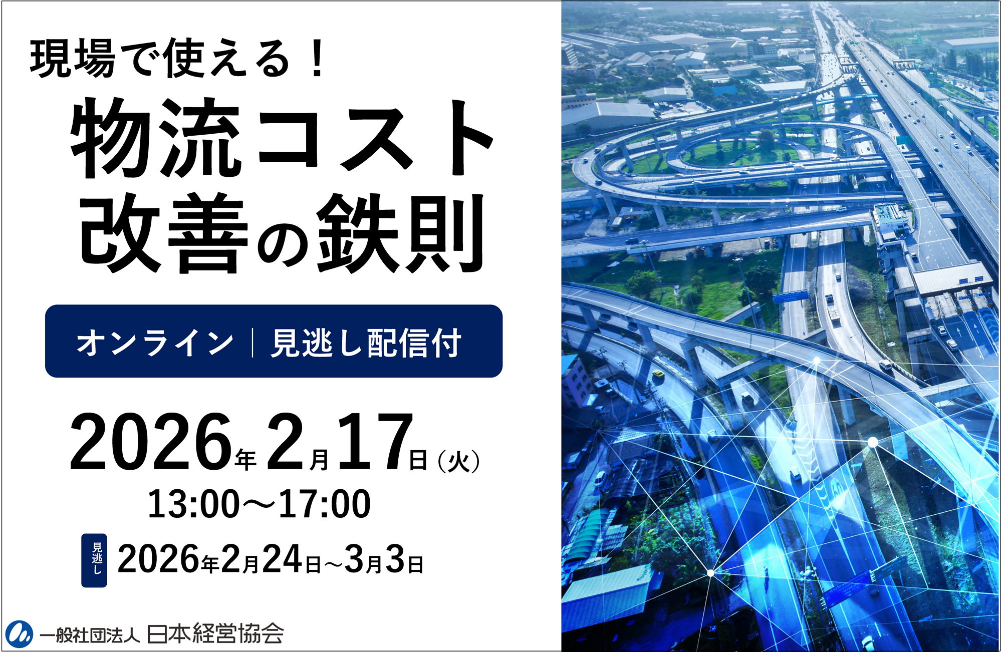 一般社団法人日本経営協会(NOMA)は2026年2月17日、オンラインセミナー「現場で使える!物流コスト改善の鉄則~物流二法改正対応!~」を開きます。物流コストの「構造理解」を起点に、値下げ交渉や高額投資に頼らない改善の進め方を学ぶ内容で、受講料は会員3万5200円、一般4万2900円です。