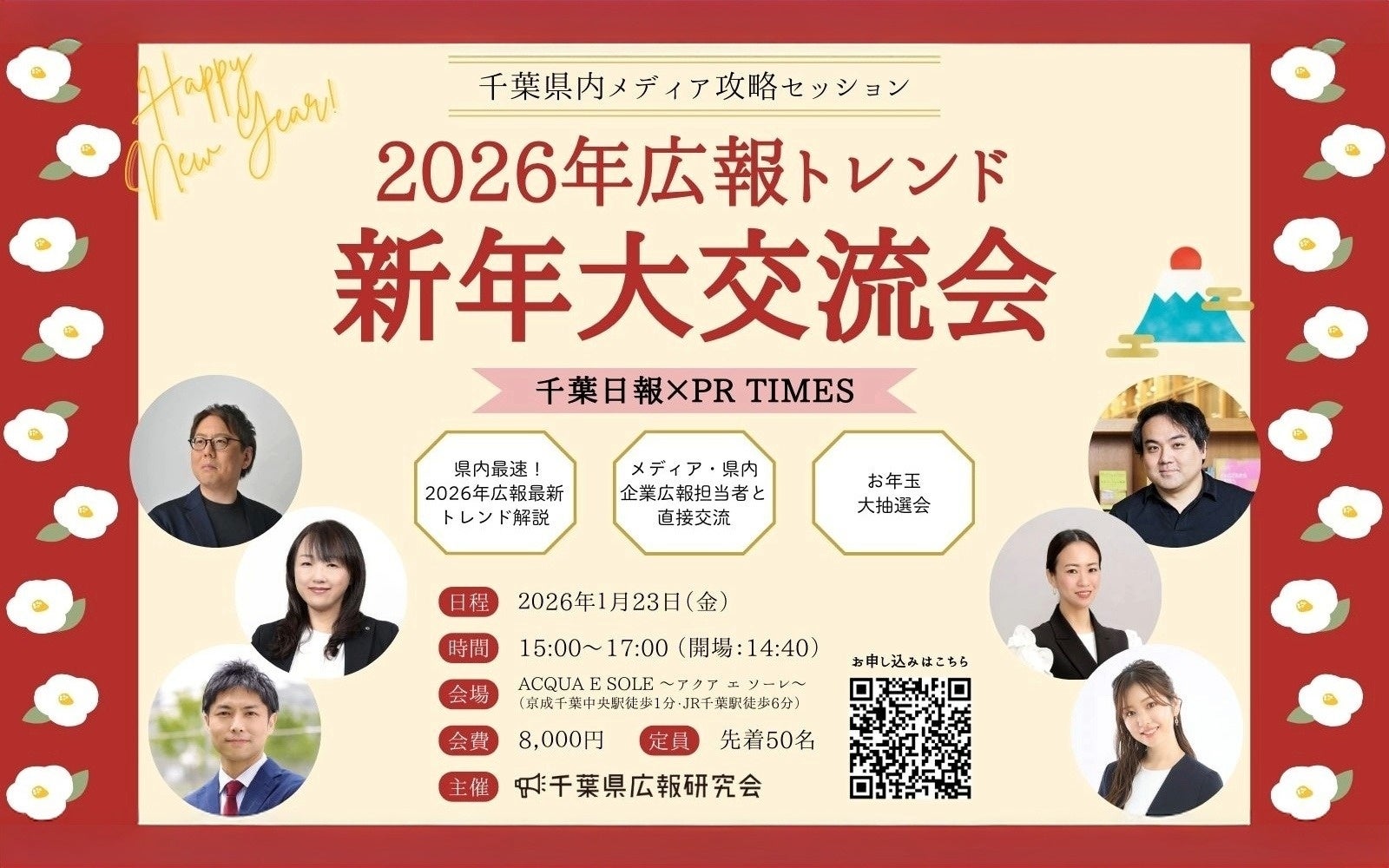 千葉県広報研究会は2026年1月23日、広報担当者向け交流イベント「新年大交流会2026」を千葉市中央区のACQUA E SOLEで開きます。15時~17時(受付14時40分~)で、参加費は8,000円(税込、食事・ドリンク付き)。先着50人で、申込締切は1月15日です。16日以降はキャンセル料が全額かかります。