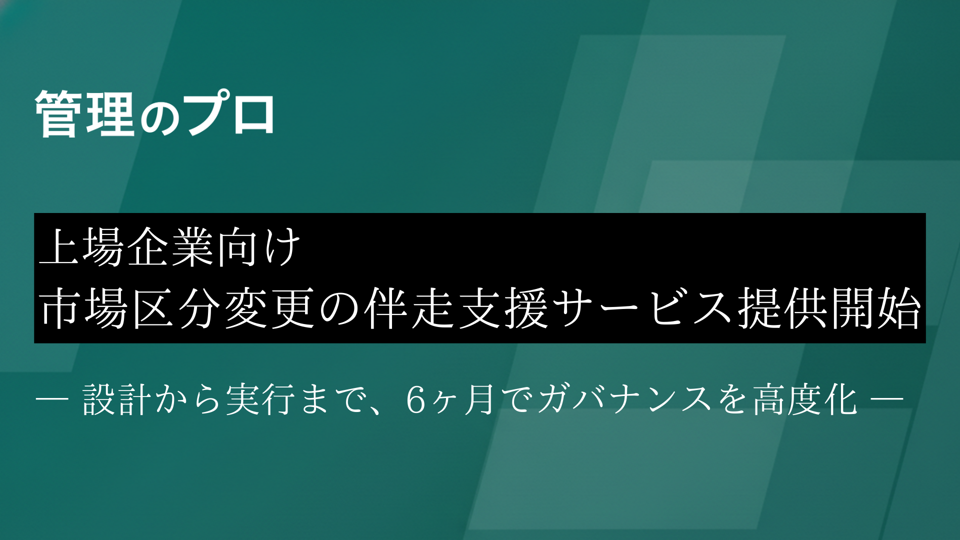 株式会社管理のプロ(東京都目黒区、代表取締役・松村史朗)は2026年2月18日、東京証券取引所の上場企業を対象に「市場区分変更 伴走支援サービス」の提供を始めます。市場区分変更に向けた準備から審査対応、実装までを一連で支援します。