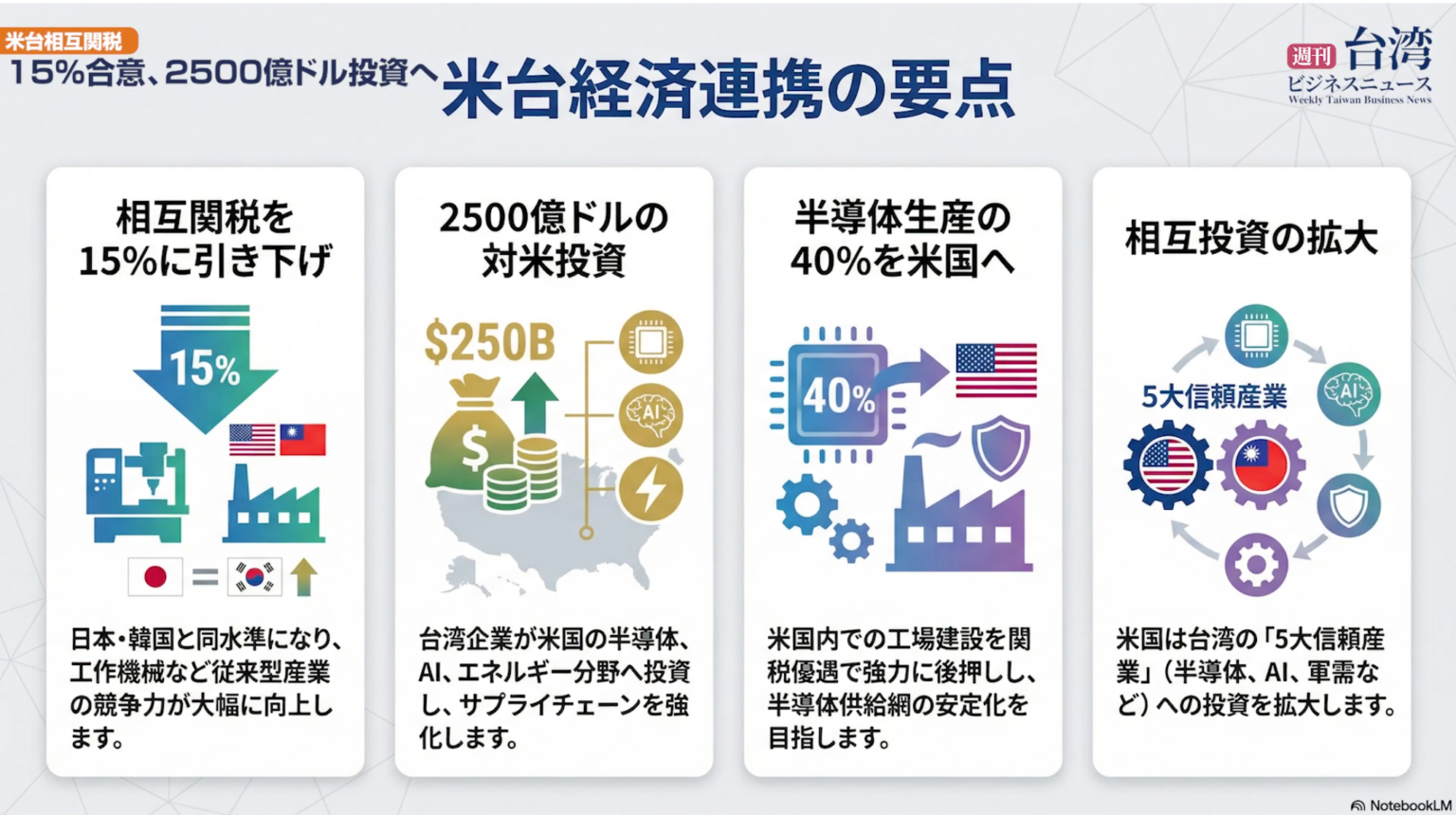 2026年1月15日、米国と台湾は相互関税を15%とする交渉合意に達したと発表されました。あわせて台湾企業による対米投資の公約は2,500億ドルとされ、台湾の輸出産業に影響する重要材料となっています。